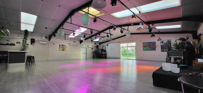 Salle climatisée et équipée de près de 300 m2, parquet, une scène, un bar associatif, un vestiaire, sono / lumière pro. Stationnement facile et gratuit.